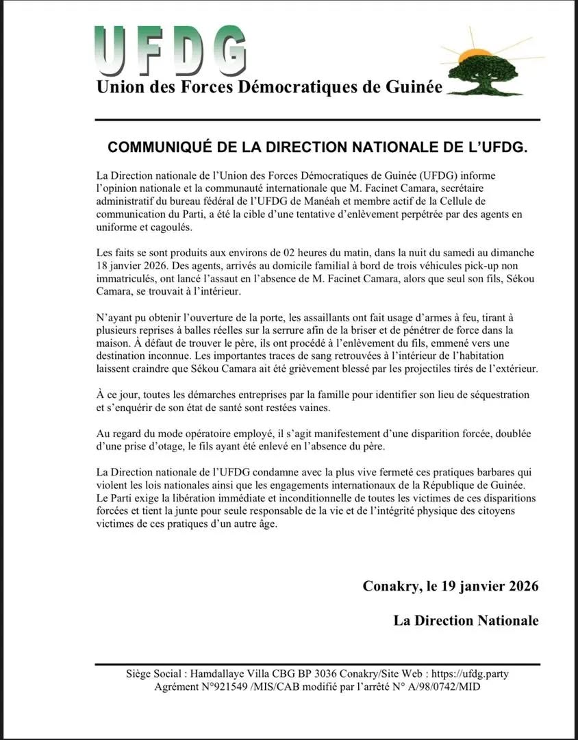 La Direction Nationale de l' Union des Forces Démocratiques de Guinée ( UFDG ) informe l'opinion nationale et la communauté internationale que M. Fainet Camara, secrétaire administratif du bureau fédéral de l' UFDG de Manéah et membre actif de la Cellule de Communication du parti, a été la cible d'une tentative d'enlèvement perpétrée par des agents en uniforme et cagoulés.
