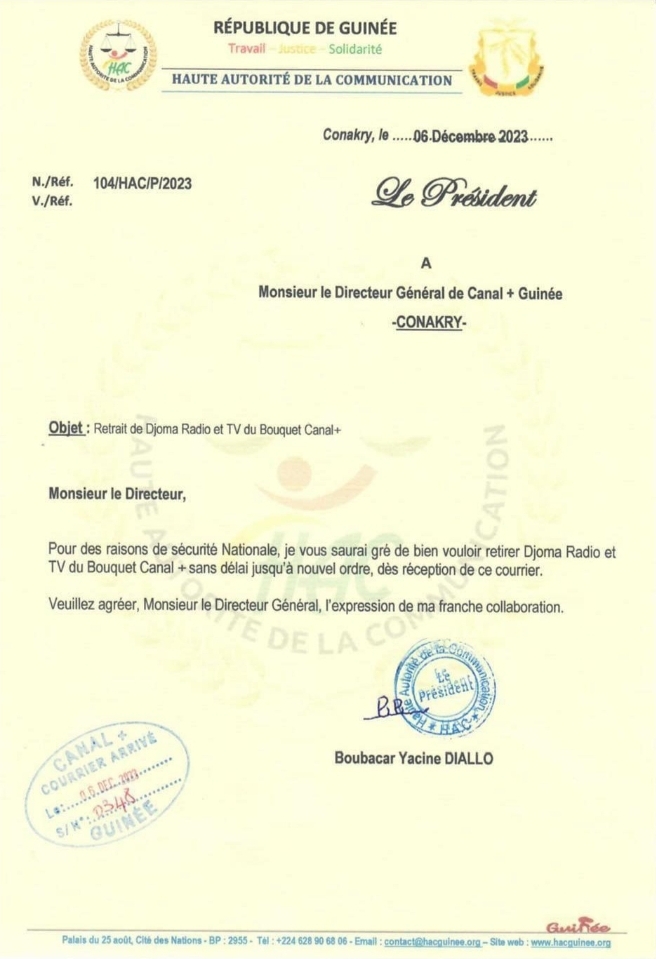 Suspension de médias en cascade en Guinée. Pour les abonnés de Canal+dans le pays, c’estl’écran noirsur les chaînesDjoma,EvasionetEspace. Le 6 décembre, la Haute Autorité de la communication (HAC), l’autorité régulant le secteur des médias, a demandé au directeur général de Canal+ de retirer la chaîne d’information et de divertissement privéeDjoma(TV et Radio) de son bouquet pour des raisons de“sécurité nationale”et“jusqu’à nouvel ordre”. Trois jours plus tard, les mêmes raisons ont été invoquées pour demander le retrait des chaînes privées Évasion(TV et FM) etEspace(TV et FM). Ces chaînes, suivies dans le pays, ont également été retirées de la plateforme de services de télévision payante StarTimes depuis le 12 décembre, pour les mêmes motifs, sans détails. Son directeur général n’a pas souhaité répondre aux questions de RSF avant d’avoir reçu, selon ses dires, un “ordre officiel”.