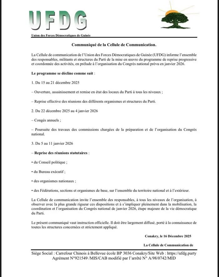 La Cellule de Communication de l' Union des Forces Démocratiques de Guinée ( UFDG ) informe l'ensemble des responsables, militants et structures du parti de la mise en oeuvre du programme de reprise progressive et coordonnée des activités, en prélude à l'organisation du Congrès national prévu en janvier 2026.