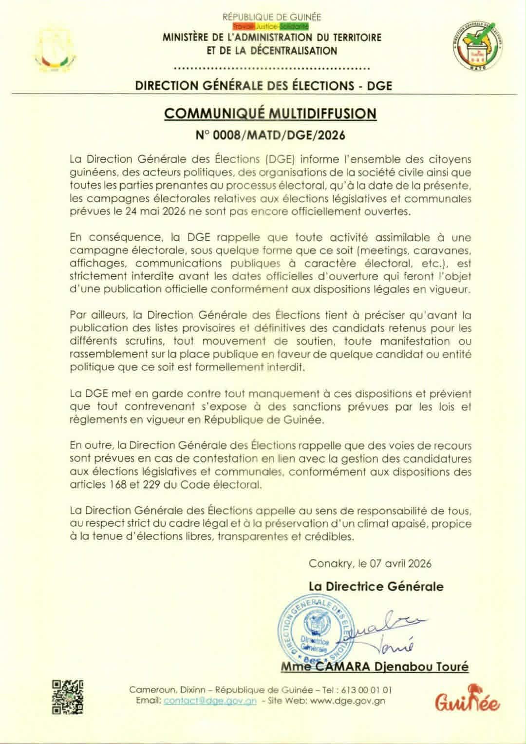 La Direction Générale des Elections ( DGE ) informe l'ensemble des citoyens guinéens, des acteurs politiques, des organisations de la société civile ainsi que toutes les parties prenantes au processus électoral, qu'à la date de la présente, les campagnes électorales relatives aux élections législatives et communales prévues le 24 mai 2026, ne sont pas encore officiellement ouvertes.